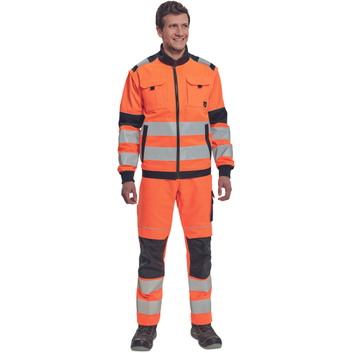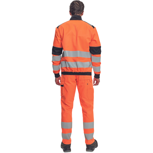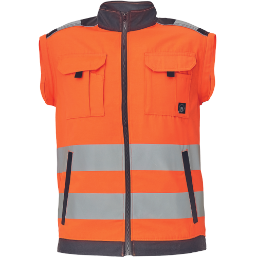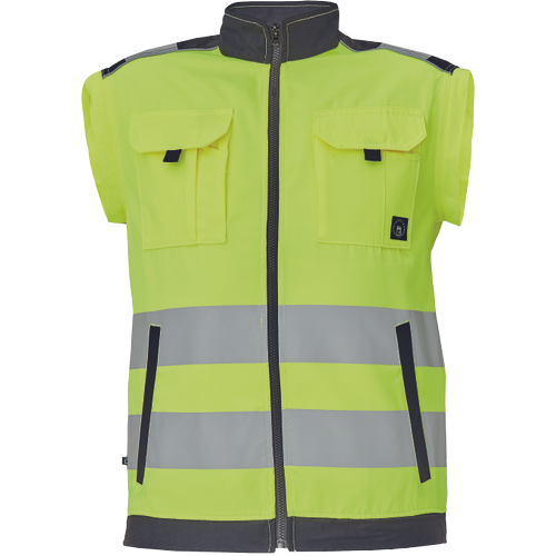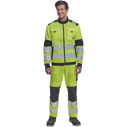 pánská HI-VIS pracovní bunda se zapínáním na zip; odepínatelné rukávy; 2 přední kapsy, 2 náprsní kapsy; Oxford 600D zesílení v oblasti ramen; dvojice tištěných 7 cm reflexních pruhů přes zadní obvod pasu a rukávů; 2 menší pruhy přes ramena; reflexní paspulky lemující zesílené části rukávů a ramen; pružné náplety manžet rukávů a elastický spodní obvod pasu.